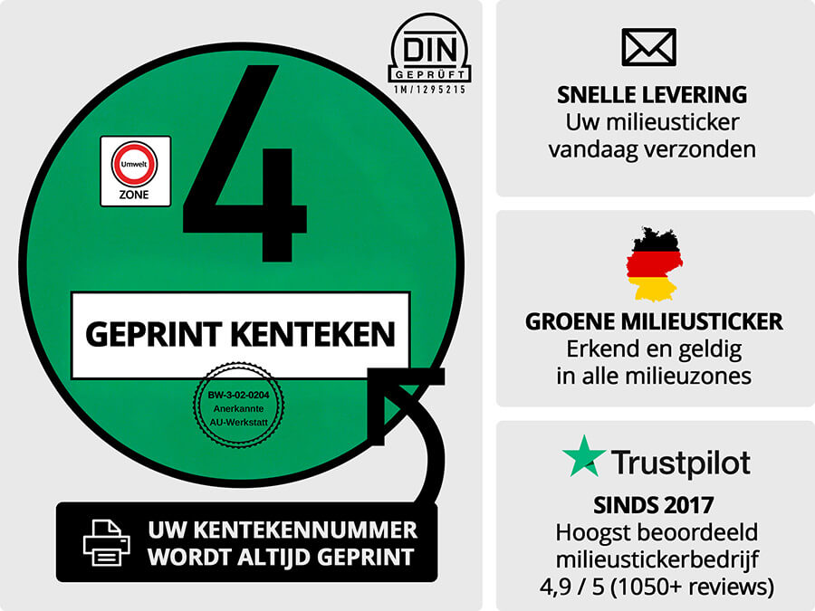 Een milieusticker voor Duitsland, ook wel bekend als een "Umweltplakette", is een milieucertificering die aantoont dat uw voertuig voldoet aan de emissienormen die gelden in de lage-emissiezones van Duitsland. Deze sticker is bedoeld om luchtvervuiling te verminderen en de luchtkwaliteit in stedelijke gebieden te verbeteren. Voertuigen zonder de juiste sticker mogen deze zones niet betreden, wat kan leiden tot boetes. De sticker wordt vaak in de voorruit geplakt en is verplicht in steden die milieuzones hanteren, zodat toezichthouders gemakkelijk kunnen controleren of voertuigen aan de eisen voldoen.