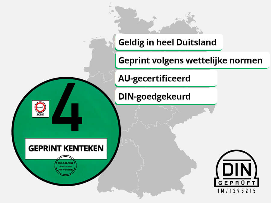 Voor elektrische auto's geldt in Duitsland meestal een speciale regeling. Aangezien elektrische voertuigen geen of zeer beperkte schadelijke uitstoot hebben, komt uw auto vaak in aanmerking voor de meest milieuvriendelijke sticker, dat is de groene sticker. Dit maakt het rijden in lage-emissiezones niet alleen toegestaan, maar ook voordelig vanwege de lagere milieu-impact. Voor elektrische voertuigen bestaat er optioneel ook een E-Plakette voor Duitsland, een (blauwe sticker) , deze sticker vervangt niet de verplichte groene milieusticker.